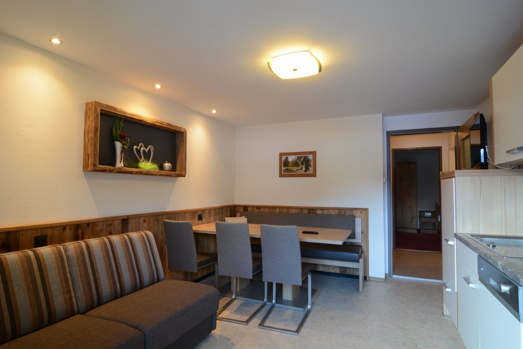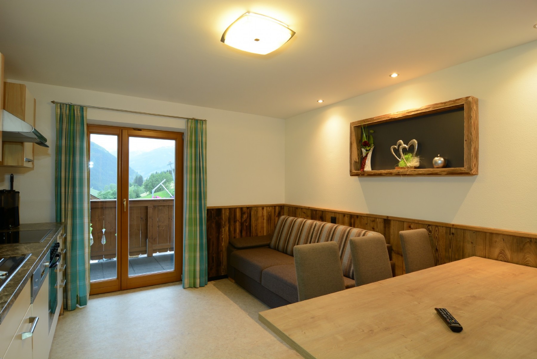 Das ideale Appartement für Pärchen und Kleinfamilien! Freuen Sie sich auf bequeme Betten, eine komplett eingerichtete Wohnküche mit Geschirrspüler und Schlafgelegenheit sowie ein Wohnschlafzimmer mit Kabel-TV, Radio, Telefon, Safe und angrenzender Dusche mit WC und Haarföhn. Vom Balkon aus haben Sie einen herrlichen Bergblick. Im gesamten Appartement besteht kostenloser W-LAN-Anschluss.